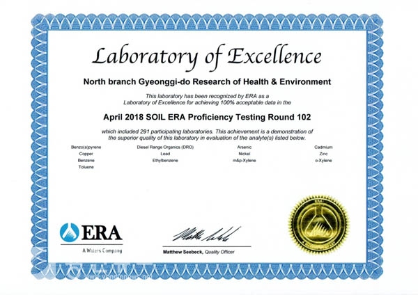 경기도보건환경연구원북부지원이 국제숙련도 평가기관인 미국 환경자원학회(ERA) 평가에서 2년 연속 토양오염(Soil pollution)분야 최우수 분석기관 (Laboratory of Excellence)에 선정됐다고 22일 밝혔다.