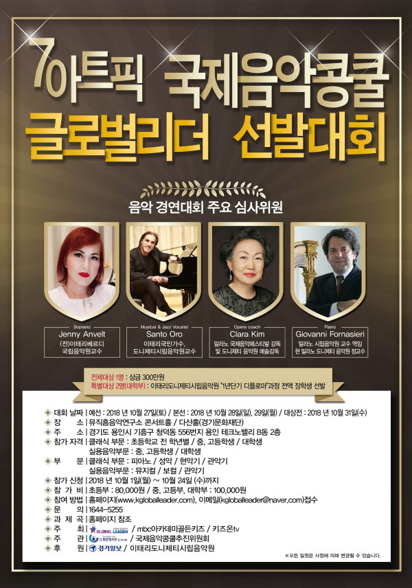 (사)글로벌리더가 주최하고, 이태리 도니젯티 시립음악원, 7아트픽, 키즈온TV, MBC아카데미아트스쿨이 후원하는 이번 선발대회는 미래 글로벌 리더의 인재발굴 및 육성을 목적으로 기획됐다.