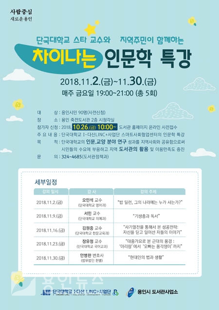 용인시는 11월 2일~30일 죽전도서관 시청각실에서 단국대학교 교수 5인이 진행하는 5회의 인문학 특강을 개최하기로 하고 참가자를 모집한다.