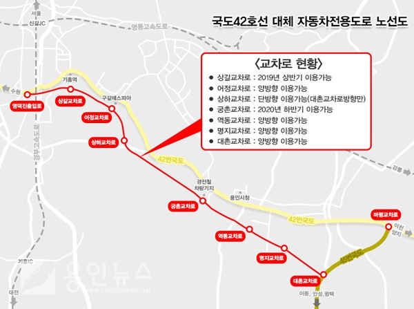 용인시 중심부를 동서로 연결하는 국도42호선을 우회하는 자동차전용도로가 착공 10년 8개월만인 30일 오후2시 개통한다.