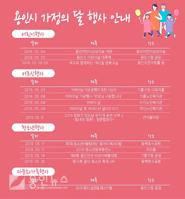 백군기 용인시장은 “가정의 달을 맞아 온가족이 즐길 수 있는 다채로운 행사를 마련했다”며 “함께 즐기며 가족 간의 화목을 다지는 계기가 되길 바란다”고 말했다.