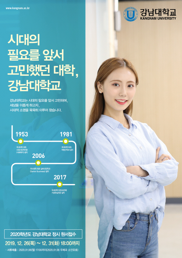 강남대학교는 2020학년도 정시에서 486명(30.2%)명을 모집한다. 2020학년도 정시모집은 '가', '나', '다' 군에서 지원 가능하며, 원서접수 기간은 12월 26일부터 12월 31일까지이다.