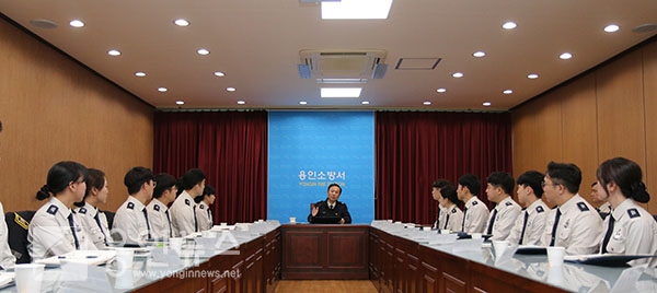 | 용인소방서장의 직무교육을 듣고 있는 신규 직원들 (사진제공-용인소방서) |
