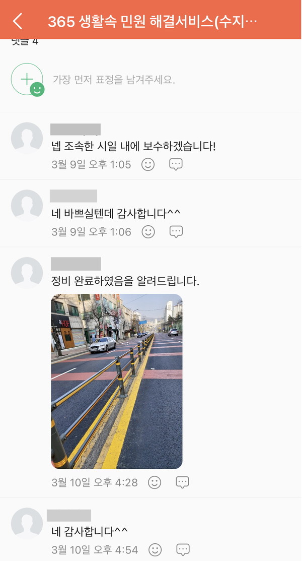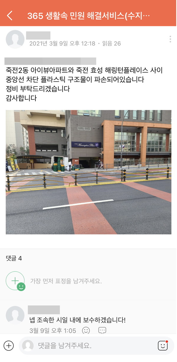 수지구 죽전2동에 거주 중인 A씨는 아이뷰아파트와 효성해링턴플레이스 사이 중앙선 플라스틱 구조물이 파손된 것을 발견했다. A씨는 네이버 밴드를 통해 구청에 신고했고, 하루 만에 조치한 결과를 사진으로 받아볼 수 있었다.