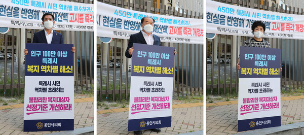 용인시의회(의장 김기준)는 27일 오전 10시 세종특별자치시 보건복지부 앞에서 김기준 의장과 의원들, 특례시 시장 및 의장들과 함께 사회복지 특례권한 확보를 위한 기본재산액 고시 개정을 촉구하는 4개 특례시 릴레이 1인 시위를 진행했다.