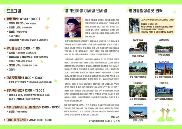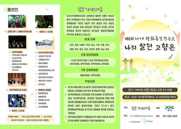 (사)경기민예총(이사장 김태현)은 제8회 2024 평화통일장승굿 ‘나의 살던 고향은’을 오는 10월 5일(토) 오전 10시부터 옛 선감학원터인 경기창작캠퍼스에서 개최한다. 이번 행사는 경기민예총이 주최하며 2024 평화통일장승굿추진위원회, 의정부민예총, 안산민예총이 공동주관하고 경기도가 후원한다.