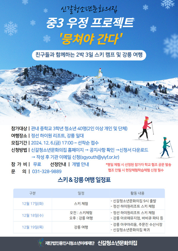 관내 중학교 3학년 청소년 2인 이상 개인 및 단체로 구성된 40명을 모집하여 12월 17일(화)부터 12월 19일(목) 총 2박 3일로 진행된다.